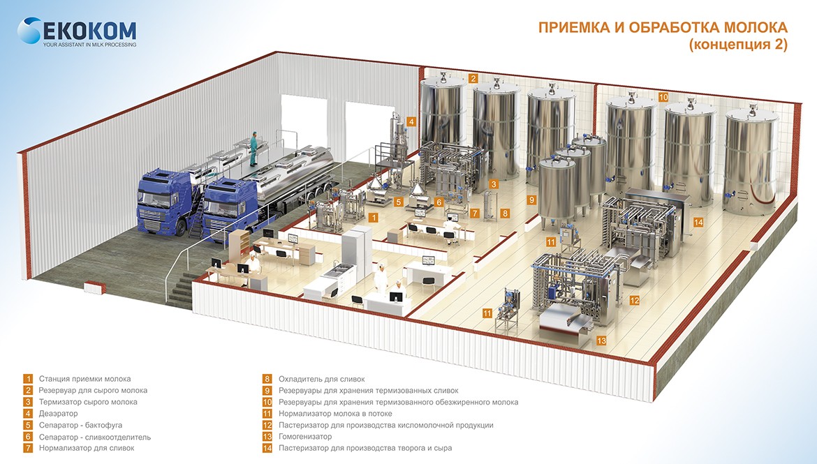 Автоматизированная линия для приемки и обработки молока состоит из приемного и аппаратного участков. Приемный участок предназначен для приема, учета, деаэрирования, очистки, термизации и сепарирования молока. Аппаратный участок предназначен для хранения, нормализации, гомогенизации и пастеризации молока.