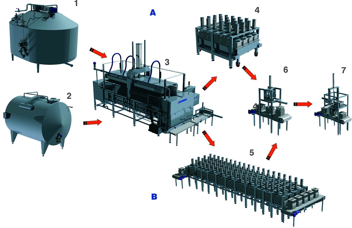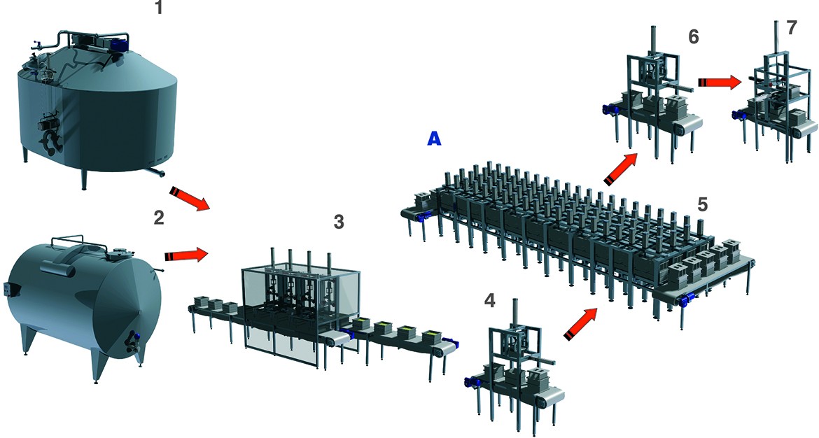 Подготовка сырного зерна с последующей термической обсушкой, возможность порционного дренирование сыворотки (1) или (2), формирование пласта под слоем сыворотки индивидуально непосредственно в форме с последующей подпрессовкой (3), установка крышек (4), автоматизированное выстраивание форм и окончательное прессование по заданному режиму (5), снятие крышек (6), извлечение сырных блоков из форм (7).