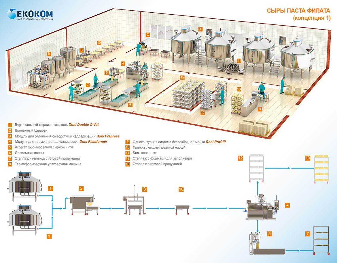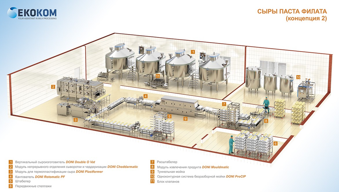 Такая схема производства подходит для средних и крупных предприятий. Производительность участка может достигать 40 000 кг готового продукта в сутки и зависит только от веса сырных головок. Процесс полностью автоматизирован, за исключением охлаждения продукта.