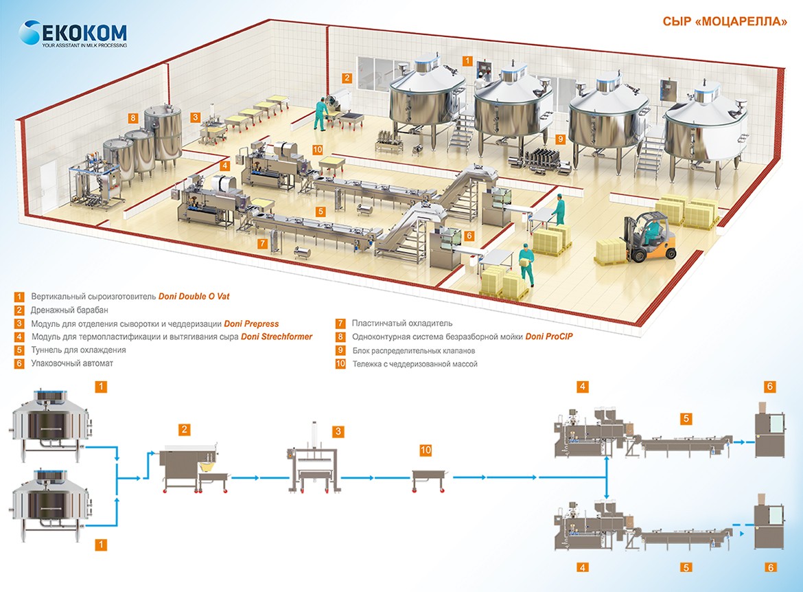 формирования пласта, после чего чеддеризуется до достижения рН 5,2-5,4. Процесс протекает за 40-60 минут. Чеддеризованный пласт нарезается вручную и подается в DONI Strechformer (4). Сформированные сырные шарики попадают в транспортный туннель (5), где охлаждаются и транспортируются благодаря потоку холодной воды. Готовый продукт упаковывается (6) в рассоле с низкой концентрацией соли.