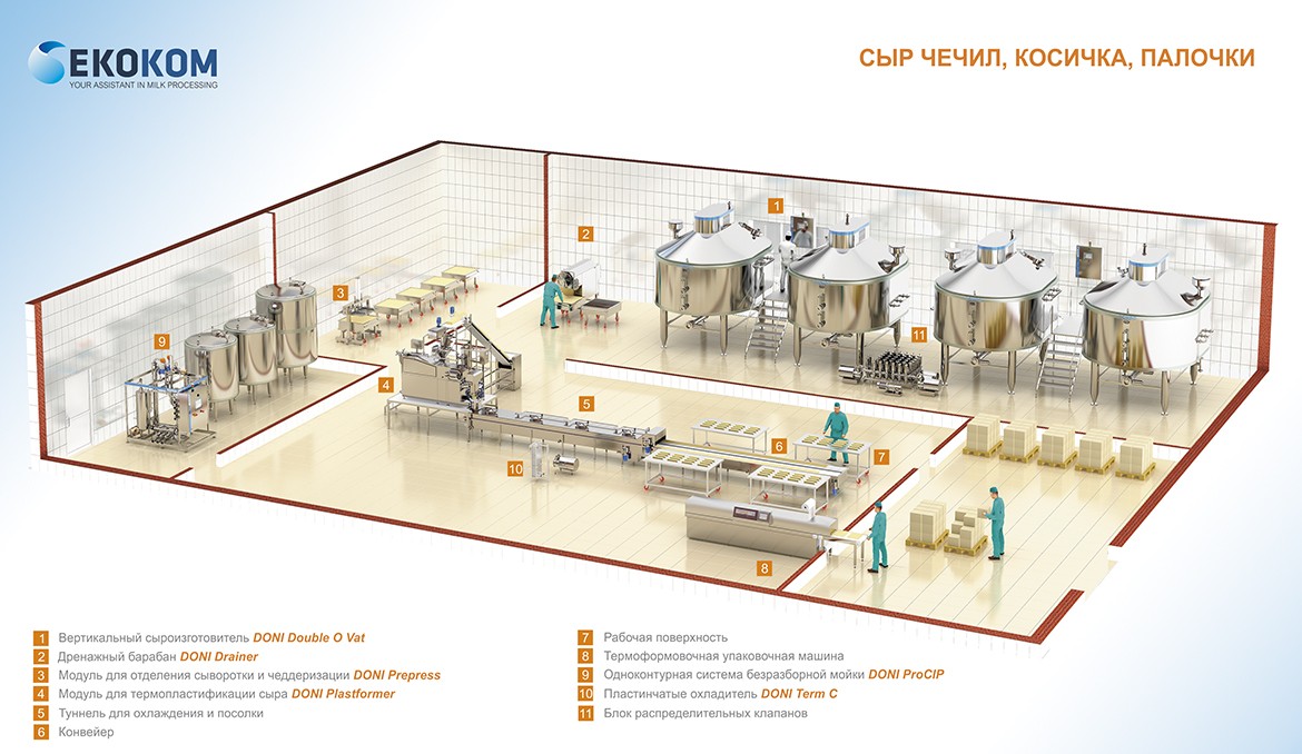 На выходе из DONI Plastformer (4) происходит формирование сырных нитей заданного диаметра, которые поступают в туннель для охлаждения и посолки (5), далее – на конвейер (6), где нарезаются на отрезки стандартной длины и перекладываются вручную на рабочие поверхности (7), где плетутся фигурные сыры - Чечил, Косичка и др. Готовый продукт упаковывается (8) и направляется в камеру хранения.